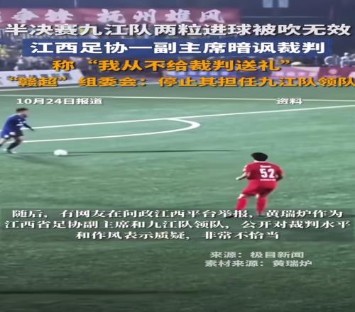 体育播报10月25日宣 据“极目新闻”报道,因在赣超半决赛次回合九江队主场0-1不敌赣州队赛后发表针对裁判的不当言论,江西省足协副主席、九江队领队黄瑞炉遭到处罚。
