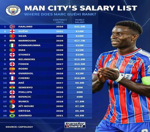 在曼城官宣格伊加盟后,德转市场发布了曼城队内的年薪榜单。哈兰德3150万欧居首,格伊和B席1800万欧位列次席。
