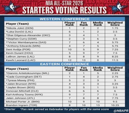 东契奇在球迷投票中排名第1,成为今年的全明星票王。但他在球员投票中仅排第6,媒体投票中排名第2,最终位列西部第2。约基奇在球迷投票中排西部第2,媒体投票也排第2,但他在球员投票排第1,最终力压东契奇高居西部第1。